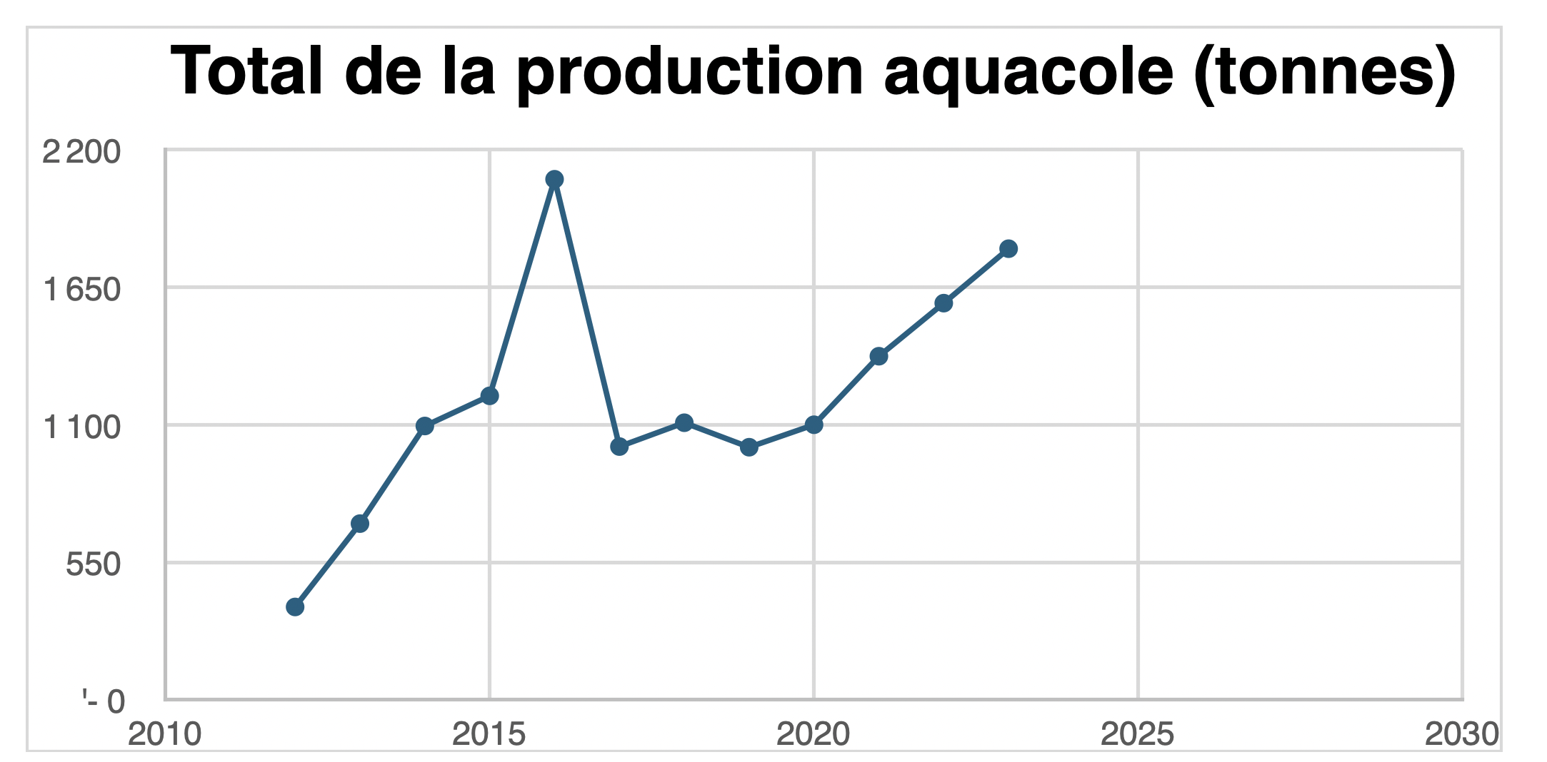 La production aquacole enregistrée au niveau national en 2023 est de 1 804 contre 371 tonnes en 2012, soit un taux de croissance de 386%.